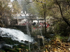 Being up late in the morning (or nothing short of dinner-time) it comes naturally that the most attractive point is a small restaurant. It's situated under the magnificent cliffs and next to the karst spring where the underground river passing trough Temnata Dupka exits.{sc1}2 Nov 2003 3:05pm   DiMAGE 7Hi   F.length 10.3mm (35mm eq. 40.0mm)   1/180s   f/4.5   ISO 100