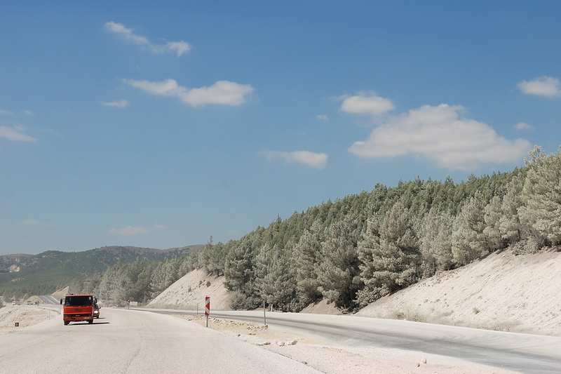 Рано сутринта, разбирай 10:30, напускаме хотелчето, където клиентът е цар. Любезният администратор ни изпраща до улицата. Тръгваме. В Анталия не видяхме кой знае какво, но беше приятно. Дори от хотела в Алания не пазим лоши спомени, да не говорим за всичката красота там. Пред нас са планините, към който тръгваме по познатите вече широки и удобни булеварди. Околността на Анталия е покрита с борови гори. Изглежда приятно, въпреки жегата. Купуваме си бензин също с приятна цена и стръмнините не закъсняват. Трафикът е сравнително слаб, пътят - твърде добър за България, но не особено за Турция. С други думи на места има ремонти, на места е неравно, на места изобщо няма настилка, а навсякъде е стръмно. Изпреварваме множество шарени камиончета, множество големи камиони, множество най-различни таратайки. Не си мислете, че е лесно - става все по-стръмно. Температурата на двигателя пълзи твърдо над 100 градуса. В добавка се движим и твърде бавно - далеч не навсякъде може да се изпреварва. Отдавна вече не карам на пета, сменям четвърта скорост с трета, за да достигна от време на време до невероятната втора. Термометърът отива към 110 и си остава там. Няма нужда да казвам, че навън са постоянните 34 °C. В един момент се налага да спра климатика. Правил съм го много, много рядко. Навън е толкова прашно, че не ни се иска да отваряме и "резервния климатик." В колата става нетърпимо, но за сметка на това се връщаме до по-поносима температура на двигателя. Климатикът пак заработва. Облекчение. Пейзажът наоколо се състои от познатите каменисти планини, осеяни с някакви бодливи на вид, суховати храстчета. Най-вече поради строителство и ремонти, на пътя има толкова прах, че на места се чувстваме като в циментовия завод в Златна Панега през 1978 година - по-възрастните сигурно знаят какво имам предвид. На места минаваме покрай борови горички, които отдалече изглеждат като заснежени!