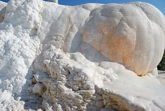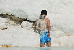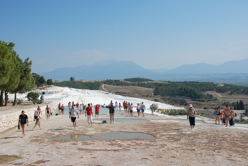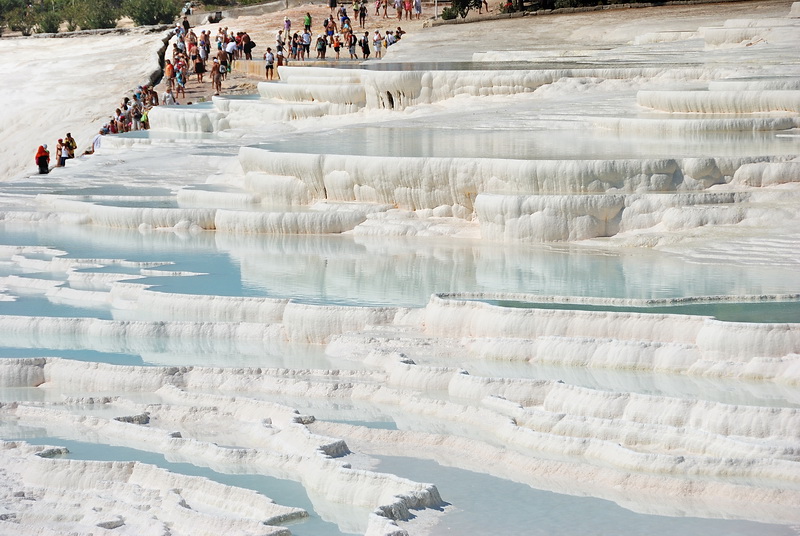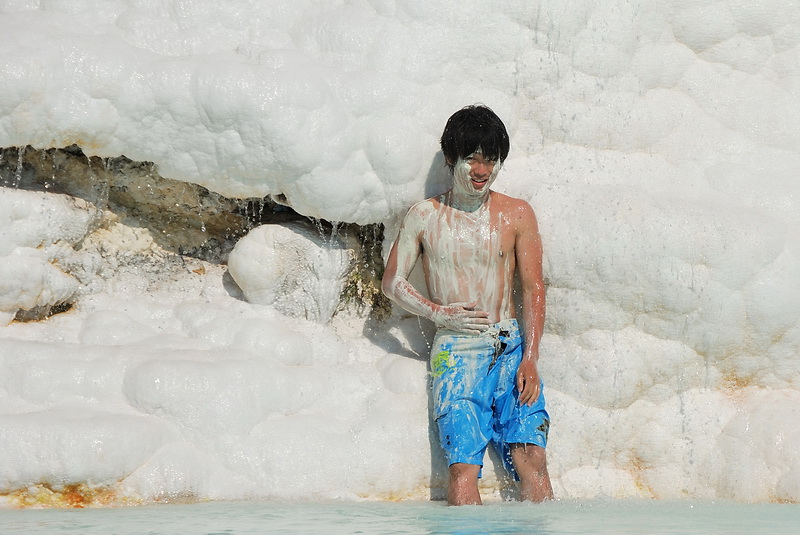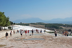Има и много туристи. Всички са боси, както му е редът и шляпат по пътеката, по която аз току-що дойдох. Горките скоро трябва да се връщат - никой не ги чака долу. Нас пък ни чака колата и с удоволствие поемаме по пътеката. Тя е малко развалена от няколко изкуствени басейна, но за сметка на това там може човек да се къпе. Ако иска - дъното е покрито с дебел слой отлагания, досущ тиня. Японец се намазва целия с това нещо - май му харесва. Почти сами, с удоволствие извървяваме пътеката до долу. Минаваме през какви ли не релефи, профили и цветове на скалата. Вертикалните и части са си все така ослепително бели. Дори само това си заслужаваше идването до Турция! Е, накрая водата се оттича встрани, а ние вече вървим с обувки по обикновен чакълест път. Слънцето вече е доста ниско, а нас ни чакат още доста планини до Кушадасъ - крайната цел за днес. Тръгваме си с нежелание. Звучи ли познато?