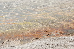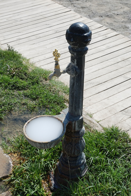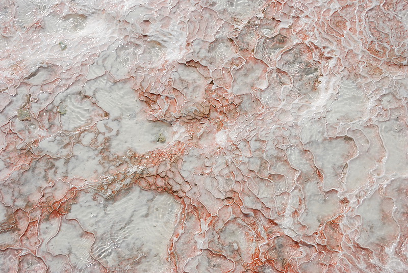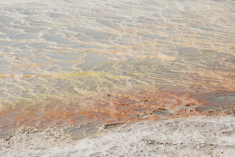 Доста пече и без тъмни очила и шапка не ще да е добре. За щастие ги имам, както и торбичка за обувките - с обувки не може, всеки ходи бос, а охранители бдят за опазването на скалата. Изкачването на пътеката е удоволствие - по цялата и дължина с бълбукане тече топла водичка. Бялата скала също е топла, гладка и много приятна за ходене. А благодарение на торбичката за обувките, закачена на колана, ръцете са свободни за Никона. Докато стигна до горе, съм направил няколко десетки снимки. Прелестно е! А като казах обувки - така и никой не разбра защо не си взехме джапанки.