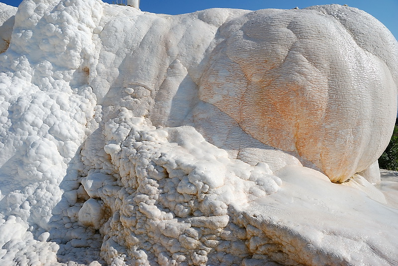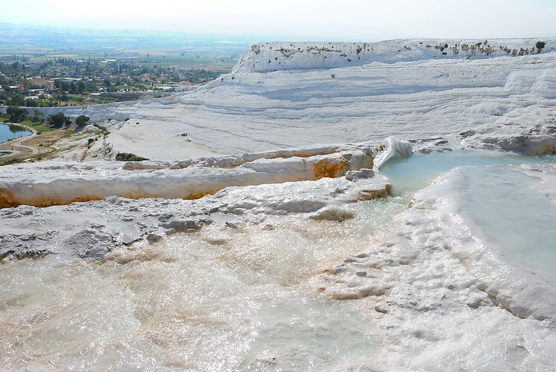 Горе намирам жените, които вече са успели да разгледат останките на стария град. Аз не проявявам особен интерес за сметка на гледката - невероятно е! Вървим по ръба на бялата скала, наоколо бълбукат поточета, надолу е огромно празно пространство чак до равнината със селото, а погледът се спира в планините, които са на километри. Горната част на скалата не е съвсем бяла, а е красиво обагрена в разцветки на червено, оранжево и кафяво, чак до черно. Досещам се за наличие на желязо, хром и манган във водата. Натъкваме се на чешмичка. Само дето това, което изтича от нея малко прилича на боза. В часовете по химия му казвахме варно мляко. Достигаме до чудните, бели образувания. Водата някакси е изваяла плитки басейнчета с тесни като ръбчета стени. Вътре изглежда синьо - отразява се небето. Приказно красиво е!
