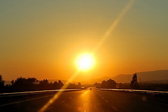 Към Кушадасъ пътят е доста натоварен, но се кара леко - всички спазват правилата. Около нас става все по-населено, преминаваме през множество селца и градчета. Прекосяваме покрайнините на големия град Айдън и се качваме на магистрала. Най-после се движим по-бързо, а денят е към края си. Наблюдаваме красив залез. Магистралата свършва, но не плащаме нищо - малко съобщение ни уведомява, че поради рамазана преминаването е безплатно. Всъщност мислим си, че пише това. Следва тесен път със завои и стръмнини, и вече сме в Кушадасъ.