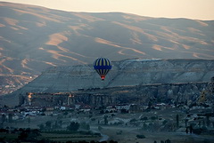 Още сме в Кападокия и ни предстоят интересни неща. Отново ставаме рано, даже по-рано от предишния ден, но вече сме по-подготвени. От вратата ни се разкрива вече познатата, но все така великолепна гледка. Лампите наоколо отново светят жълто в синкавия мрак. Бързо, бързо извървяваме 100-200 метра по селската улица, гордо наричана Sunset Road, и се озоваваме върху хълма, в който е издълбано хотелчето ни. Уж знаем какво да очакваме, но видяното е далеч по-хубаво, по-цветно, по-мащабно и по-интерсно и от най-добрите ни очаквания. Пред нас се открива обширното равно място до с. Гьореме, което постепенно преминава в тиквените полета и завършва с огромните скали ала Колорадо. Мястото тъне в мрак, а от него безшумно се издигат повече от 40 балона. Доста пъстри са, но в синкавата мрачина цветовете им не личат много. Контрастират само яркооранжевите пламъци на пропановите горелки, които загряват въздуха вътре. Това става с бучене, след което гробната тишина моментално се възстановява. Поради ранния час не се чувства и най-малък полъх на вятър, а именно това е целта. И при най-малък намек за вятър почти неуправляемите балони просто не летят. Съжаляваме, че не сме си взели топли дрехи, но мръзнем в името на страхотната гледка.