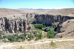 За пореден път си спомняме за капаните за туристи. Вътре в каньона безусловно е красиво, но нищо не може да ни впечатли. Над главите ни са огромните скали. Долу тече мътничка рекичка с красиви вирчета и върби. Прехвърлени са мостчета. Не е никак лошо, но друг е въпросът, че в Анадола това вероятно не може да се види на други места и хората се впечатляват. Размесваме с крака познатите огромни количества пепел. Доколкото природата е красива, това не може да се каже за скалните църкви, които са в потресаващо лошо състояние. Носят следите на прекалено много вандали. Църквите в музея край Гьореме са в пъти по-хубави и по-запазени. Отчаяни се разхождаме наоколо и си спомняме как красива какичка се прехласваше по телевизията какво невероятно място посещаваме в момента. Може пък за ценителите да изглежда по-хубаво. Околните къпини ме карат да спра. Наоколо се мотае безцелно местен тип и не прави нищо, просто ни гледа. Съжалявам, че оставих момичетата сами. Скоро те се връщат, ненамерили нищо интересно. Толкова за Ъхлара.