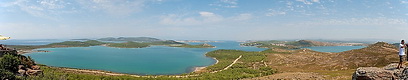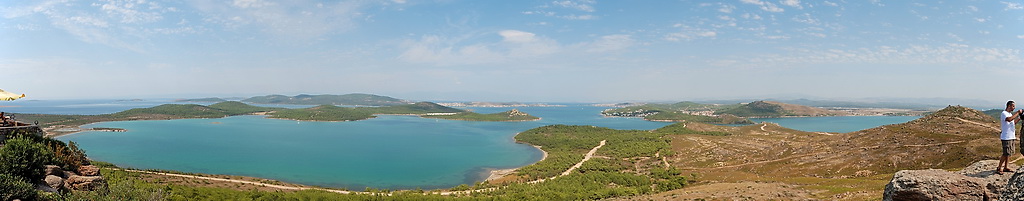 Движим се все по на север по познатия път. Току до нас е приказно синьо море. От другата страна пробягват наситено розови солници - напомнят ни за езерото Туз. Достигаме Айвалък. Толкова сме слушали за това място, че не можем да го подминем. Джафкалото ни води към Шейтан софрасъ или иначе казано Трапезата на дявола. Това е една височина, от която се открива красива гледка към живописно изрязания бряг и многобройните острови наоколо. Изкачваме се, за да достигнем паркинг с познатите забрани за паркиране наоколо. 4 лири. Добре. Изгледът наистина е разкошен. Морето е много синьо. Сушата е покрита с яркозелени борови гори. Всичкото това на почти 360 градуса около нас. Единственото, което красивата какичка от телевизията не каза е, че целият връх на хълма е зает от заведения, от които се носи музика. Няма къде да постоим на спокойствие. Все пак наистина е много красиво.
