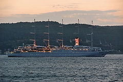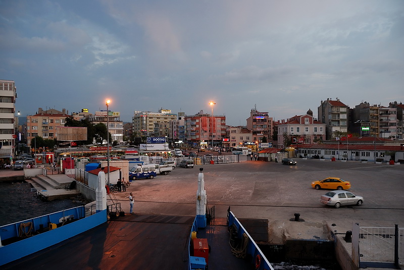 Пред нас се появява гр. Чанаккале. С едно единствено отклонение пътят извежда директно на ферибота. Докато се двоумим коя от двете линии да предпочетем, се озоваваме пред входа за по-голямата. Плащаме и влизаме. За радост виждаме как корабът пристига. От Азия духа силен вятър. Жените предпочитат да останат в колата, а аз събирам солени водни пръски с обектива на Никона. Смрачава се, има облаци, а морето е с някакъв неестествено син цвят. Там пък, където трябва да е слънцето, е неестествено розово. Няма и помен от постоянните през изминалите дни 34 ºC - в момента е само 20 и няколко. С оттренирани безброй пъти движения корабчето се долепва до кея, а ние се качваме. Корабите винаги ми носят очарование. И този съм го виждал, но с удоволствие обикалям и разглеждам всичко наоколо. Вече има български коли. Настъпва "синият час" и снимам пристанището. Всички си спомняме хубавия хотел със странно име от предишното пътуване. Точно срещу нас е. Високата горна палуба на ферибота е отлична платформа за снимки и почти не помръдва. Снимам преминаващите през протока много и интересни кораби. Откроява се голям, многомачтов круизен кораб. Да, многомачтов, защото е ветроход. Бързо става съвсем тъмно и потегляме. Вятърът се усилва едва ли не до ураганен. Странно, но не се клатим. И на тъмно прекосяването на пролива е интересно. Забавляваме се не само ние, а и всички около нас. Разминаваме се с другия ферибот и скоро пред нас е Ечеабат. Това е миниатюрно градче, което едва ли дължи съществуването си на нещо друго, освен на фериботната линия. Стъпваме в Европа. По-точно изтъркалваме се на колела. Хотелът ни е на не повече от 100 метра, но в тъмното се оставяме на джафкалото да ни води.
